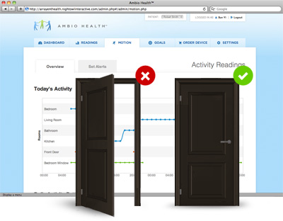 Alarm conditions can be pre-determined to alert you if there is no activity when you expect it, or if there is motion when you don’t expect it. Just as with the health meters, activity thresholds can be customized and alarms triggered as specified.